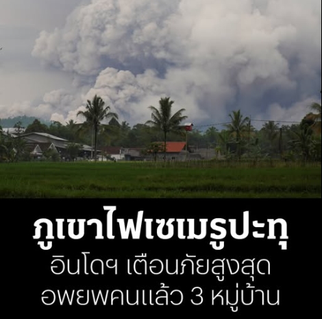 ภูเขาไฟเซเมรูปะทุ อินโดฯ เตือนภัยขั้นสูงสุด อพยพคน 3 หมู่บ้าน