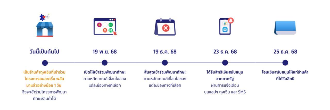 วันที่เป็นต้นไป : เป็นร้านค้าถุงเงินที่เข้าร่วมโครงการคนละครึ่งพลัสมาแล้วอย่างน้อย 1 วัน จึงจะเข้าร่วมโครงการพัฒนาทักษะร้านค้าได้